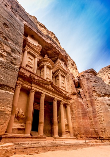 Tag 4: Der heutige Vormittag ist für eine ausgiebige Besichtigung der antiken Nabatäer-Stadt Petra reserviert. Die Tour beginnt mit einer Wanderung durch den Siq bis Sie die sogen. Schatzkammer des neuen Weltwunders Petra erreichen. Die ersten beiden Stunden erhalten Sie eine Führung von einem englischsprachigen Guide, im Anschluss können Sie die weitläufige Anlage selbst weiter erkunden.