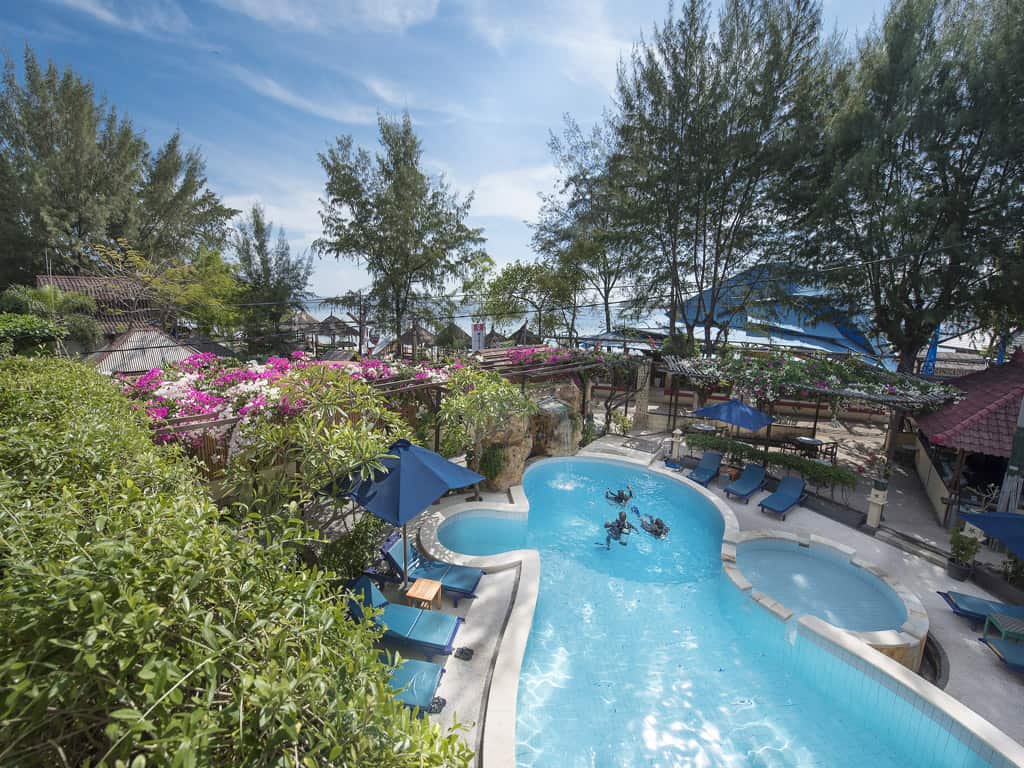 Die Villa Almarik liegt an der nördlichen Ostküste der autofreien Insel Gili Trawangan, nur durch einen schmalen Weg vom weißen Sandstrand getrennt.