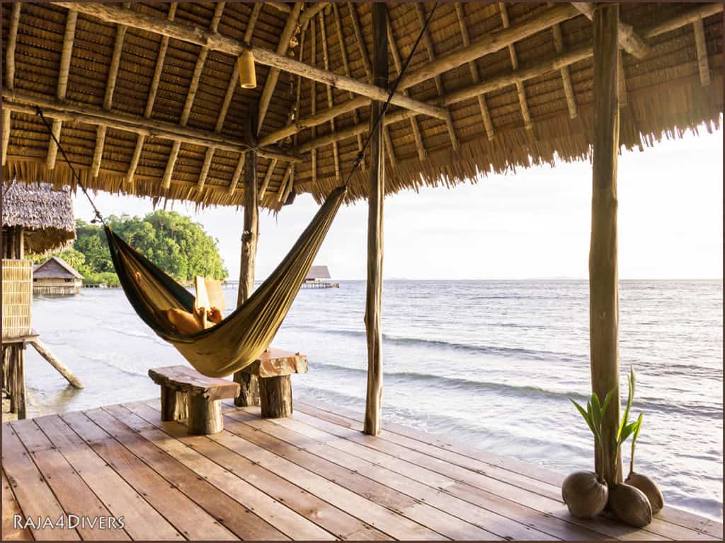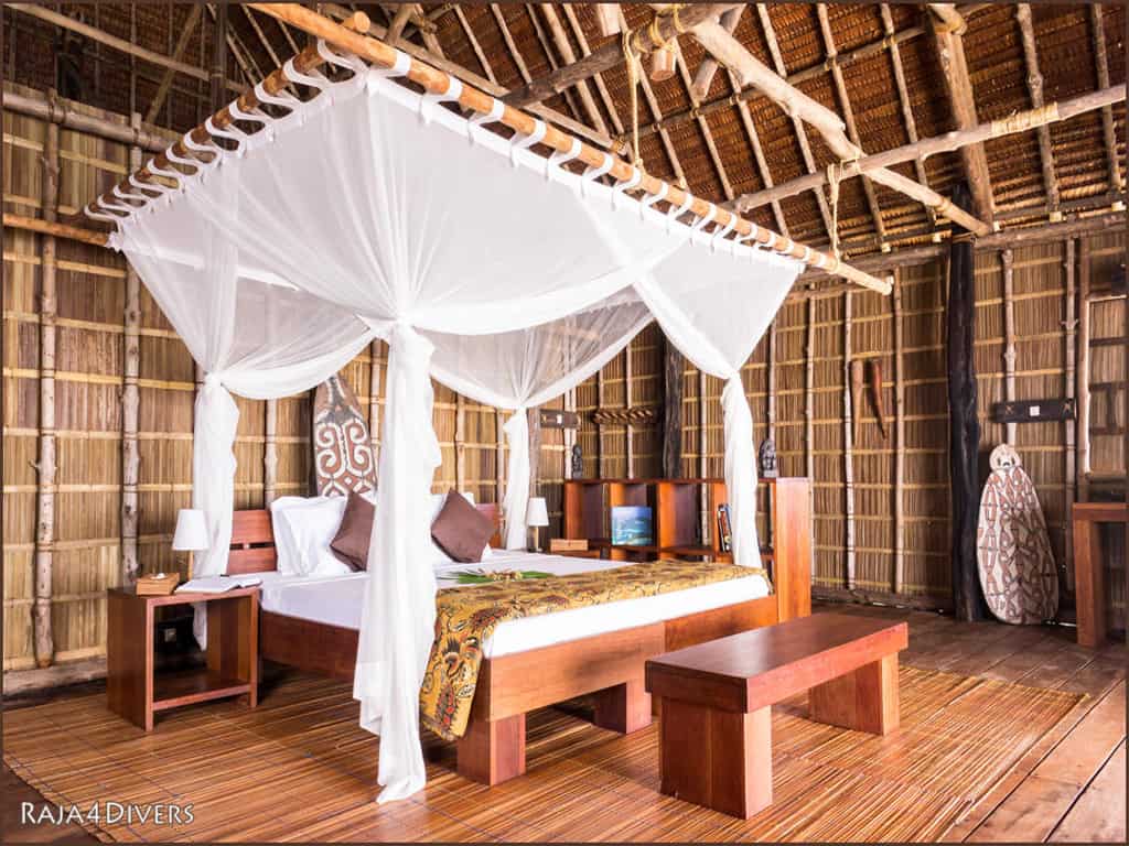 Auf Pulau Pef, einer der landschaftlich schönsten Inseln von Raja Ampat, liegt das Tauchresort Raja4Divers. Direkt am Palmenstrand befinden sich landestypische Bungalows auf Pfählen, nach Papua-Art errichtet. Jeder Bungalow bietet bis zu vier Personen Platz und ist großzügig und komfortabel ausgestattet.