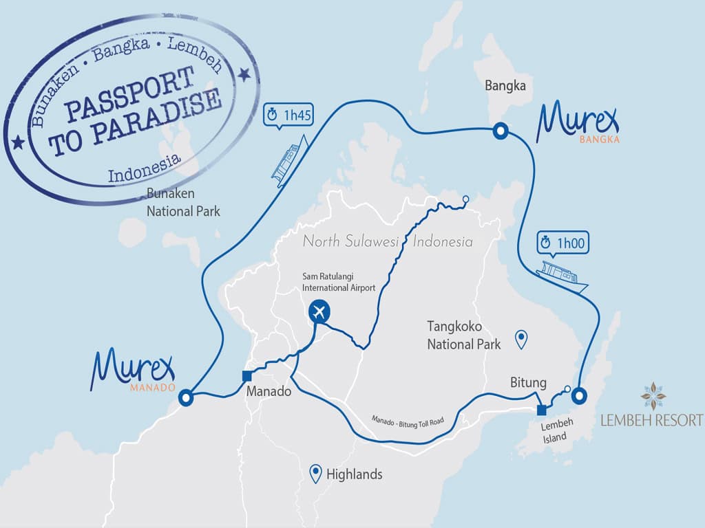Die professionelle Tauch-Organisation von Murex bringt Sie mit speziell für Tauchgänge ausgestatteten Booten bequem zwischen drei Resorts bei Manado, auf Bangka und Lembeh hin und her. Lehnen Sie sich einfach zurück und genießen Sie die Fahrt beim Tauchen oder Schnorcheln. Mit dem „Passport to Paradise“ erkunden Sie die besten Tauchgebiete von Nord-Sulawesi und erleben eine unglaubliche Unterwasserwelt: von den unberührten Steilwänden des Bunaken Parks über die farbenprächtigen Riffe rund um die Insel Bangka bis hin zur weltweit höchsten Vielfalt seltener und ungewöhnlicher Meeresbewohner in der Straße von Lembeh.