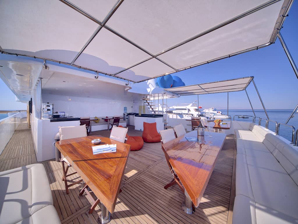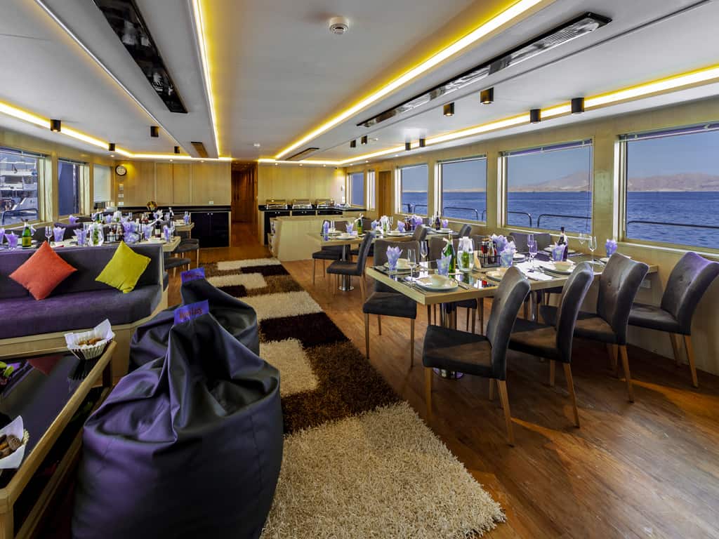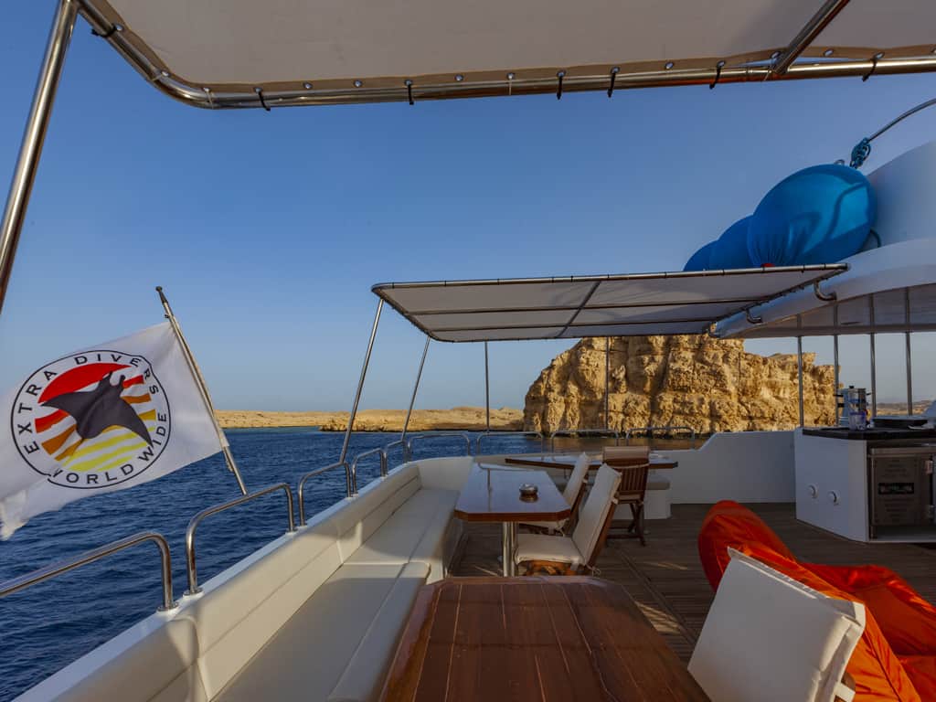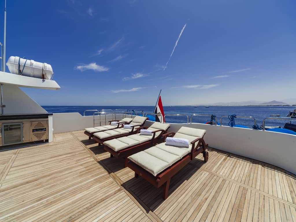 Zusätzlich bietet die MY Red Sea Explorer ein Restaurant mit Buffet, einen Salon mit Bar und gemütlichen Sitzecken, eine Tauchplattform und ein sehr großes Taucherdeck mit Stauräumen für Ihre Ausrüstung. Zum Entspannen laden die großzügigen Sonnendecks ein. Dreimal täglich werden Ihnen die abwechslungsreichen Mahlzeiten in Buffetform serviert, Nachmittags-Snacks sowie Kaffee, Tee, Wasser und Softdrinks sind ebenfalls im Preis inklusive.