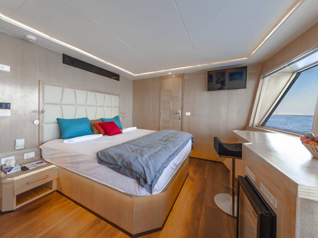Gäste an Board der komfortablen MY Red Sea Explorer werden in 12 Doppelkabinen in vier verschiedenen Kategorien untergebracht. Jede Kabine ist mit einer Klimaanlage, eigenem Bad mit Dusche/WC sowie Hand- und Badetüchern, Doppel- oder Einzelbetten, Safe, Kühlschrank und TV ausgestattet. Die luxuriöse Royal Suite liegt am Oberdeck des Schiffes und verfügt über ein großes Kingsize-Doppelbett, eine geräumige Sitzgruppe sowie eine private, überdachte Terrasse mit traumhaftem Rundumblick.