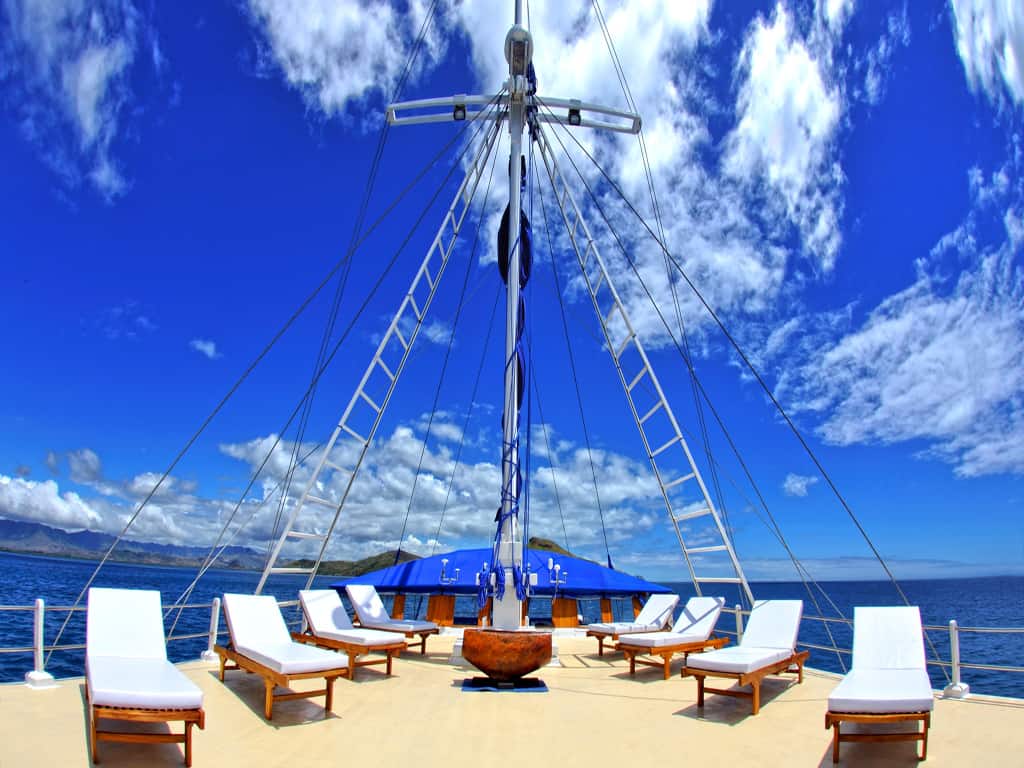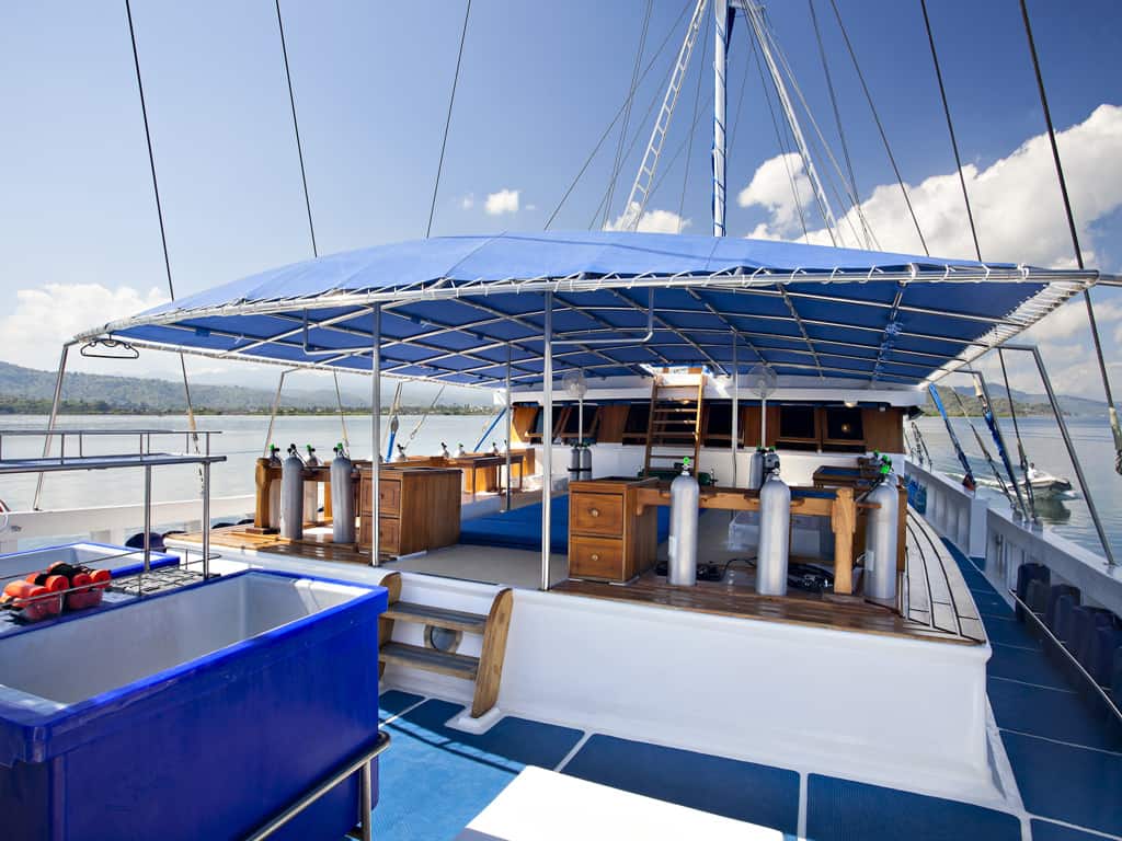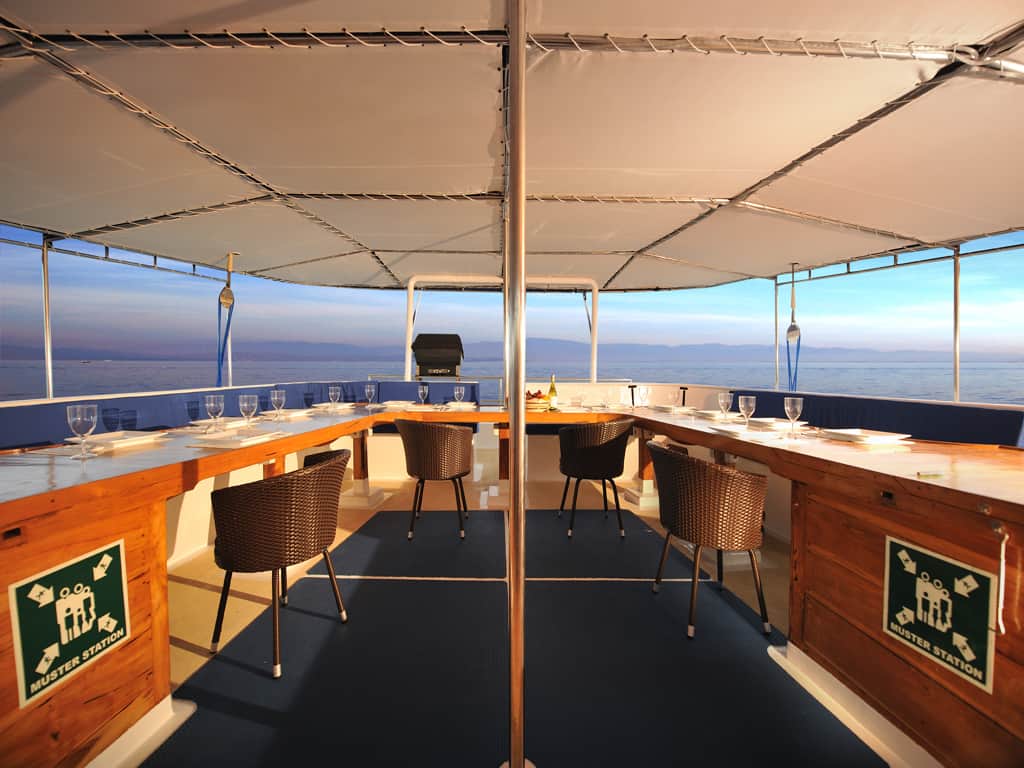 Eine klimatisierte Lounge mit Cocktail-Bar und TV lädt zum Entspannen ein. Massagen werden gegen Aufpreis angeboten. Auf den Decks gibt es einen überdachten Essbereich, wo die frischen Mahlzeiten in Buffet-Form serviert werden. Auf dem oberen Sonnendeck gibt es gepolsterte Sitz- und Liegemöglichkeiten. Taucher haben auf dem Tauchdeck viel Platz für ihre Ausrüstung. In der Lounge befindet sich zudem eine Kamera- bzw. Video-Station.