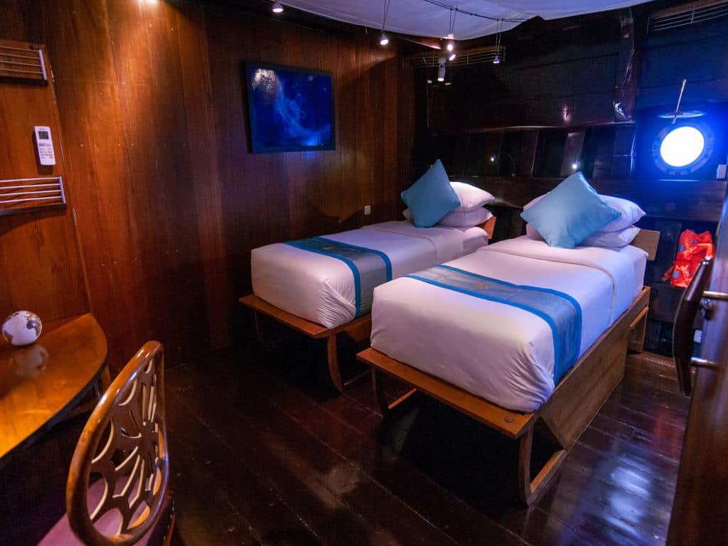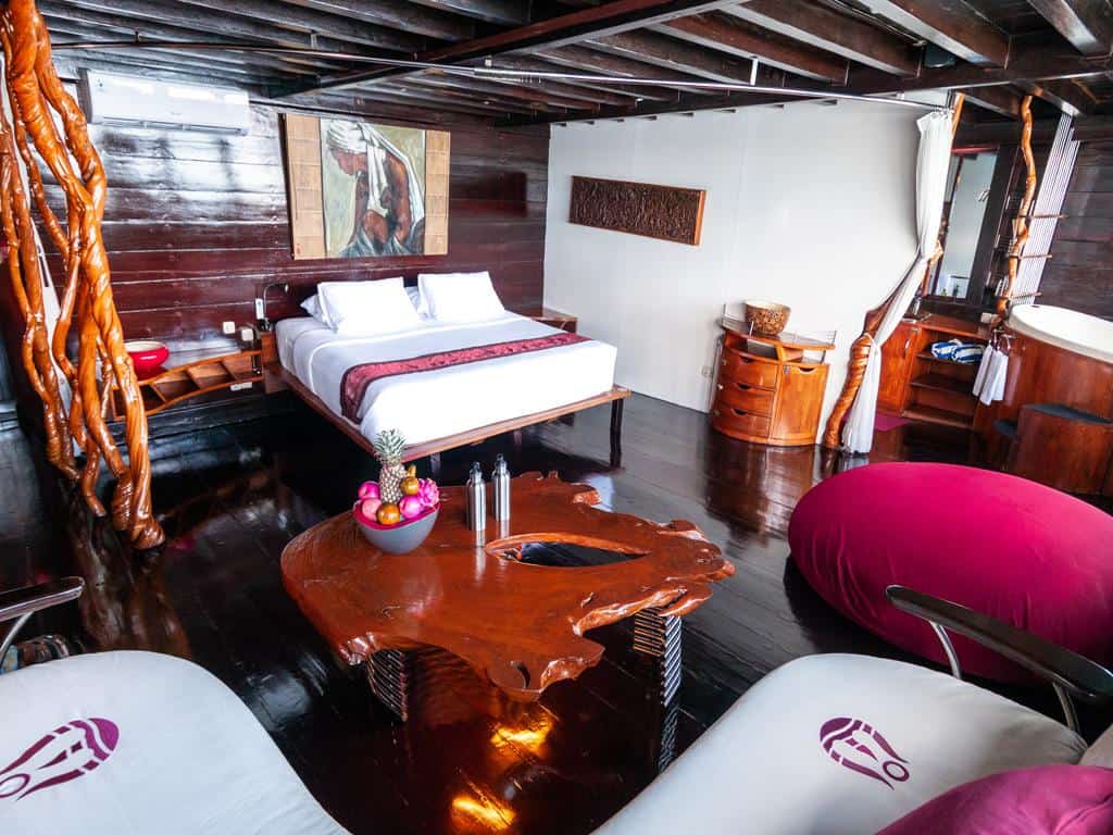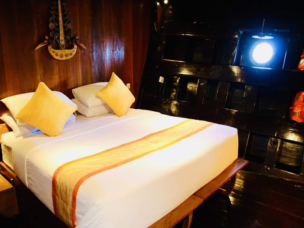 Mit einer Gesamtlänge von 58 Metern und einer Breite von 12 Metern verfügt der Dreimastschoner Dewi Nusantara über besonders viel Stabilität und Platz. Die 8 geräumigen und klimatisierten Deluxe Kabinen können mit einem Doppel- oder zwei Einzelbetten ausgestattet werden. Sie haben eine Größe von 20 Quadratmetern. Alle Kabinen haben ein eigenes Badezimmer, eine individuell einstellbare Klimaanlage und einen Minisafe. Die Hauptkabine hat mit 46 Quadratmetern die Größe einer großen Hotelsuite und befindet sich am Heck des Schiffes – ideal für einen spektakulären 180 Grad Blick übers Meer.