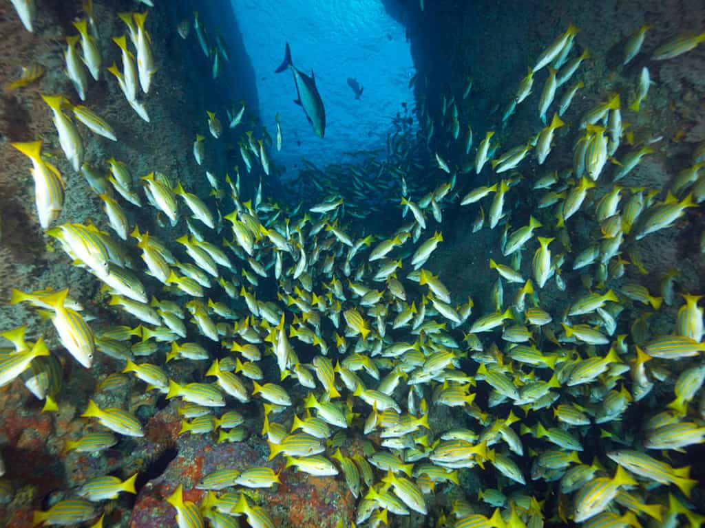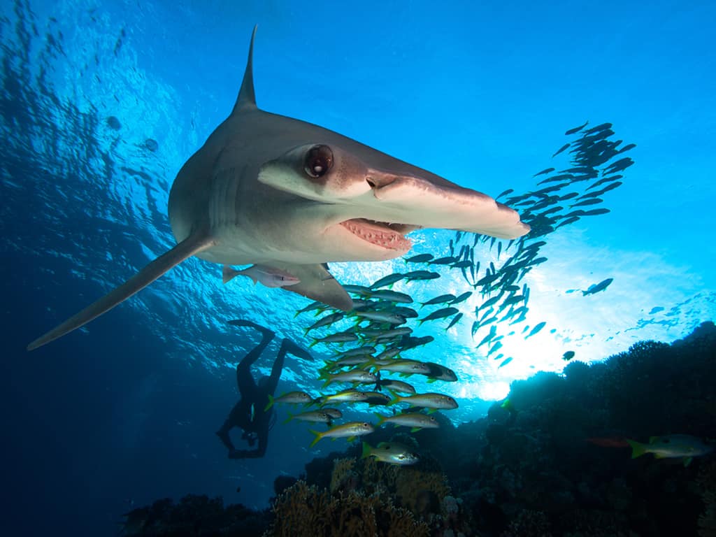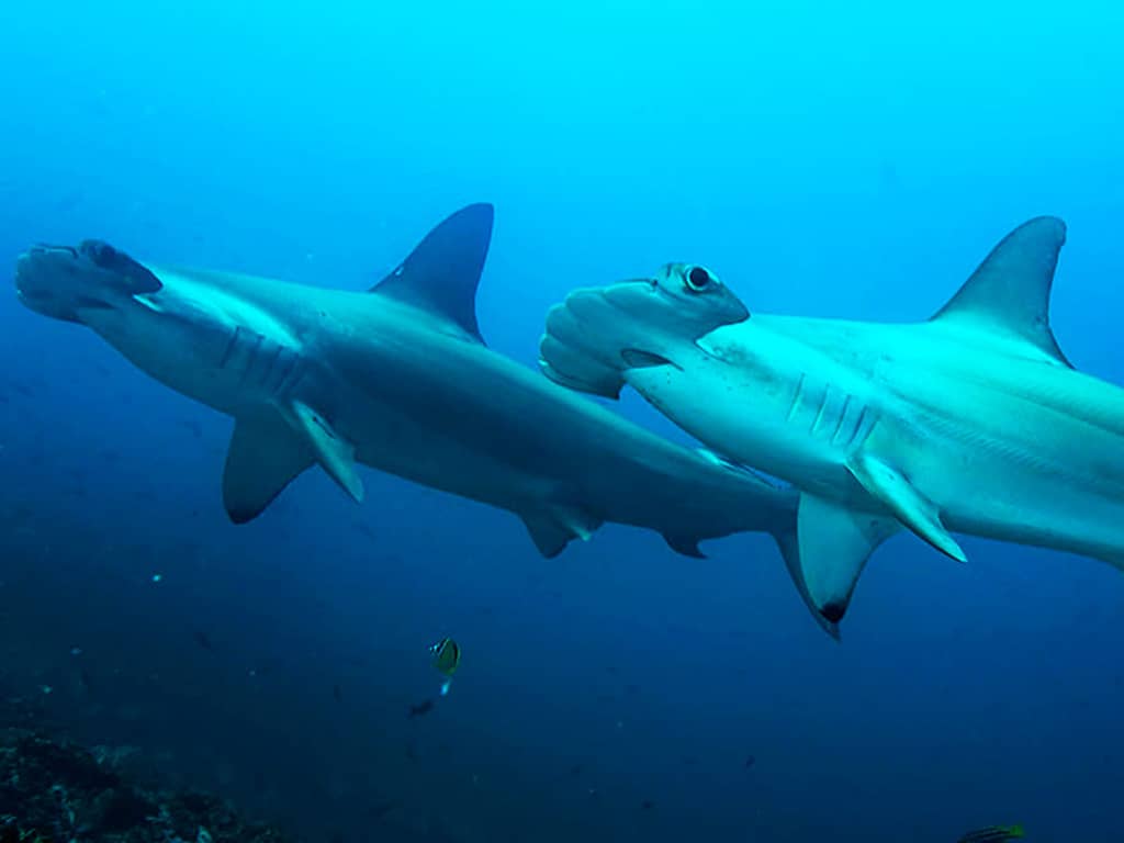 Malpelo ist der Inbegriff für spektakuläres Haitauchen! Riesige Hammerhai-Schulen, Galapagos-Haie, Malpelo-Sandtigerhaie, aber auch Mantas, Delfine, Walhaie und große Fischschwärme sorgen für einzigartige Taucherlebnisse!
