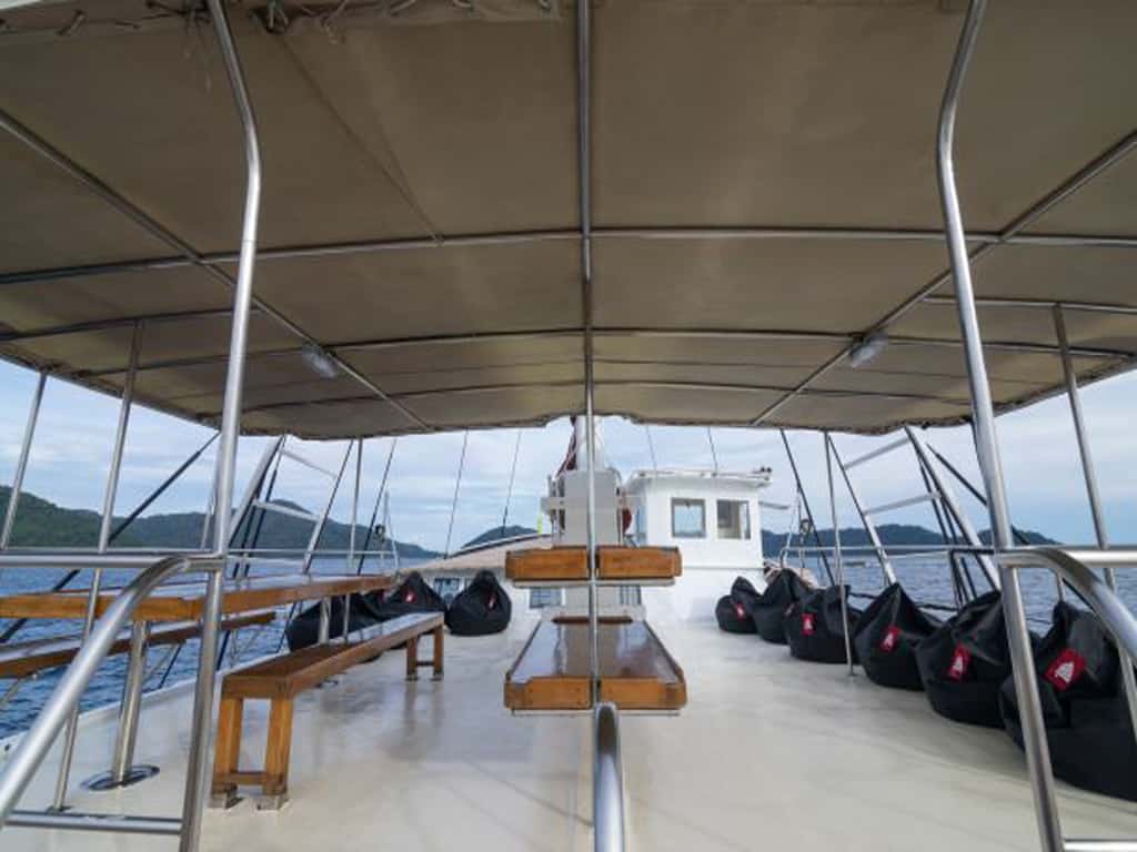 Die The Phinisi wurde eigens für Taucher gebaut, was sich in ihrer Ausstattung widerspiegelt. So bietet das überdachte Tauchdeck einen eigenen Platz für jeden Taucher zum Anlegen und Aufbewahren der Ausrüstung. Zusätzlich gibt es Nitrox und qualitativ hochwertige Aqualung Leihausrüstung. Auch eine Signalboje steht während der Tauchsafari kostenfrei für jeden Taucher zur Verfügung.