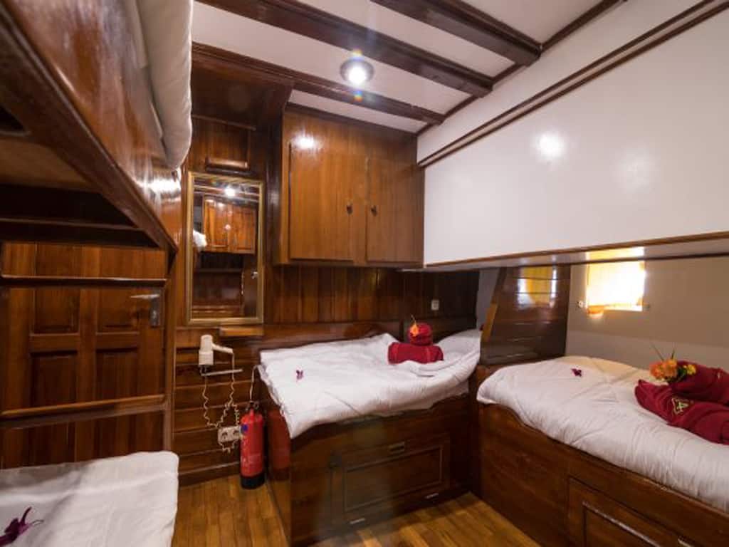 An Bord der Phinisi gibt es Platz für bis zu 18 Gäste, die in insgesamt 7 Kabinen untergebracht sind. Die Quad-Kabinen besitzen 4 Einzelbetten, alle übrigen Kabinen sind mit Twin- bzw. Doppelbetten ausgestattet. Zudem hat jede Kabine eine eigene Klimaanlage, Badezimmer mit heißem Wasser, Handtücher, Stauraum und einen Safe.