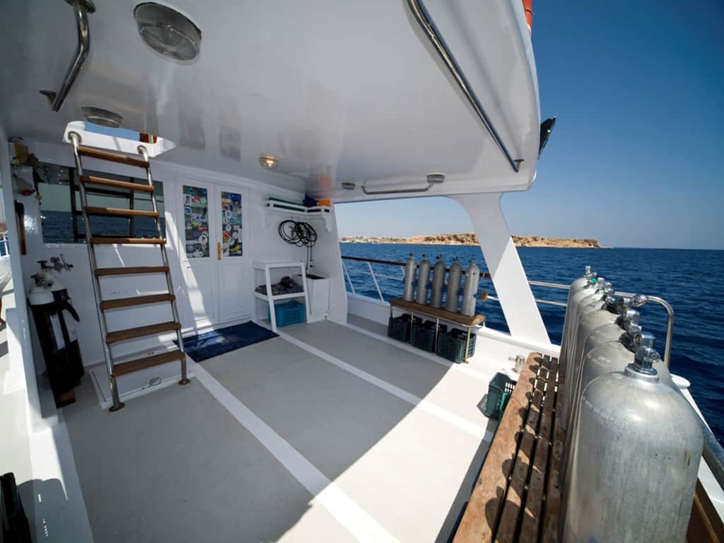 2. Tag: Morgens: Nach Erteilung der Auslaufgenehmigung werden die nahegelegenen Tauchplätze Temple oder Ras Katy für einen Checktauchgang angelaufen. Der nächste Tauchplatz ist Jackfish Alley, hier findet man mehrere kleine Grotten mit eindrucksvollen Lichteffekten. Der dritte Tauchgang führt Sie zu den Alternatives mit sieben aneinander gereihten Korallenriffen, oft besteht die Möglichkeit Leopardenhaie zu sehen. Nachttauchgänge sind hier sehr beliebt.